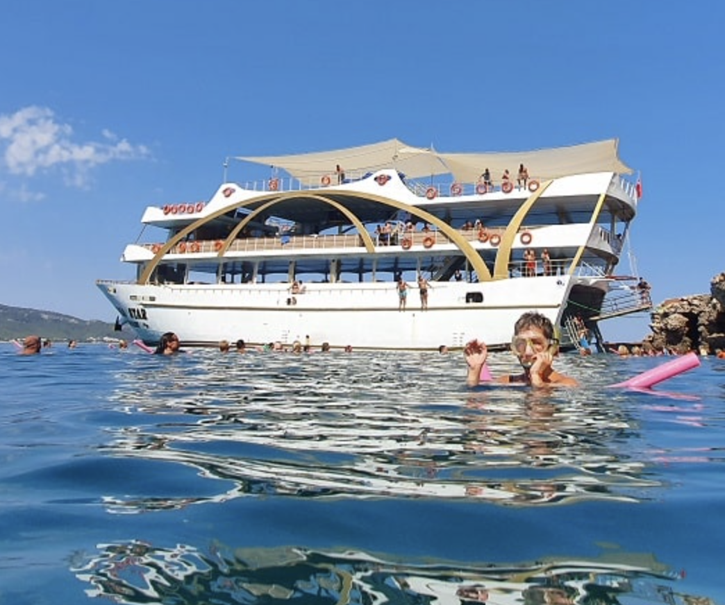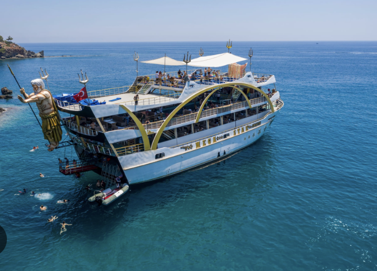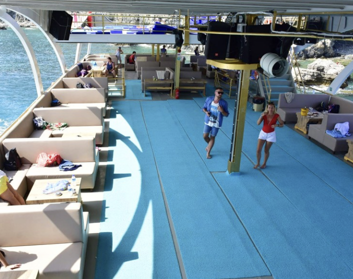 Our guests are picked up from their hotels at the specified hours. Ticket checks of our guests arriving at Kemer Marina are completed. Our guests, whose check-in process si completed, atend the morning breakfast after taking their seats. (Breakfast you can get, but by paying an extra fee.) First, we go ot Phaselis bay, where the ancient city of Phaselis is located. Here, our guests who wish can be taken ashore by lifeboats and visit the ancient city. Entrance to the ancient cityis paid as ti si affiliated with the museums directorate). Our guests who do not want ot visit the ancient city can spend time swimming. Lunch si usualy served here. Chicken, 3 types of salad, pasta or rice are served as an open buffet for lunch. Departing from here, we go to the second stop point, Cleopatra Bay, and have a swimming break for about 1 hour. After the break, our ship moves to the 3 islands region, which is the last stop point, and after the tour is completed, our boat returns to Kemer marina During the tour, a foam party and various fun filed animations are held. Afterwards, our guests are dropped off at theirhotels with our vehicles. Note: The tour route may vary at the Captain’s discretion depending on the weather and sea conditions of the day.